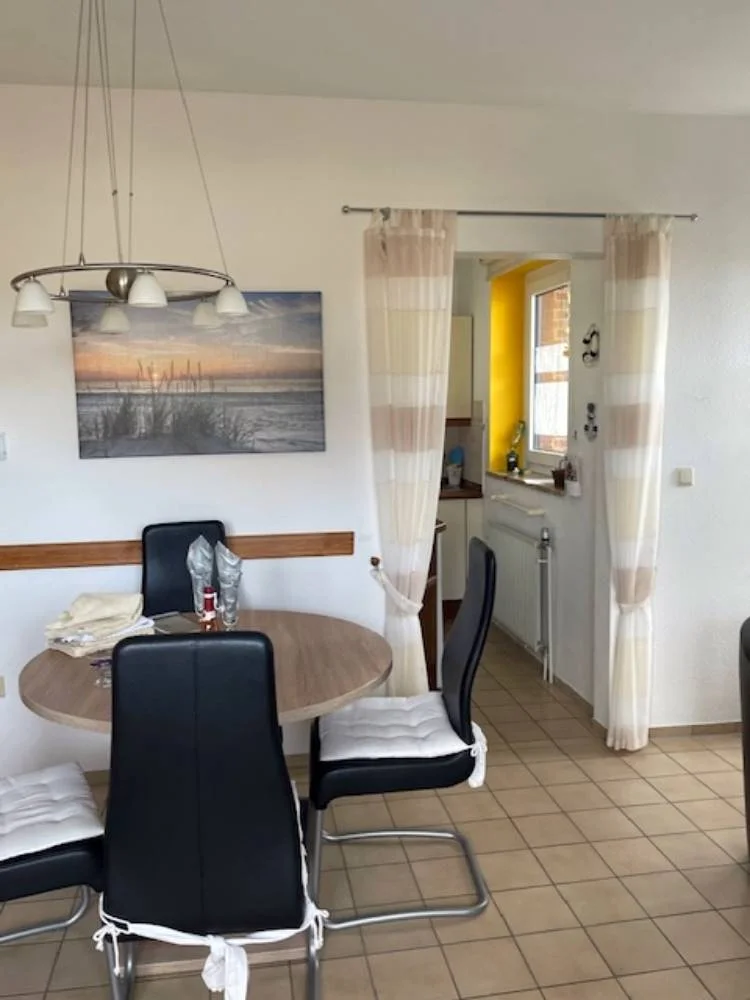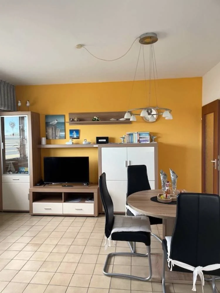 Ein Esstisch mit vier Schwingstühlen, ein TV-Gerät und ein Radio gehören mit zur Einrichtung. Der Balkon ist vom Wohnzimmer aus zu begehen.